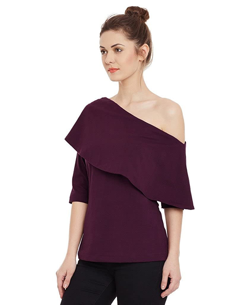 This knitted solid cotton layered one shoulder top, Has a round neck and 3/4 sleeves, Has Paneled detailing