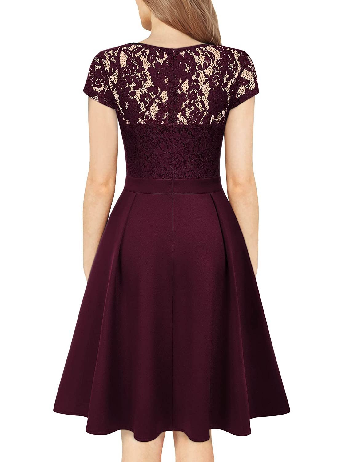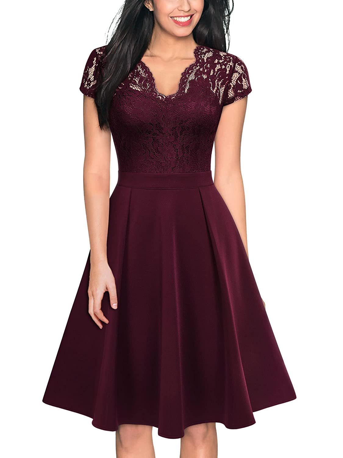 Gorgeous Flower Lace V-Neck Design, Cap Sleeve, Waist Pleated A-Line Dress.
