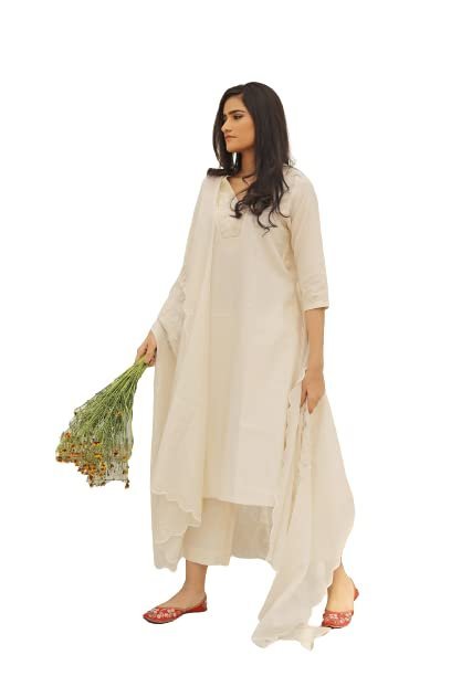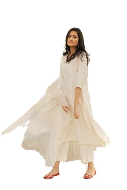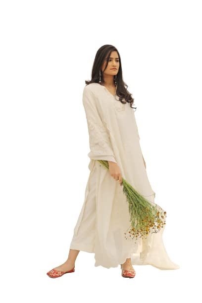 This is Neelu Sethi’s – Designer Off – white floral print dress . its a kurta palazzo set with a matching dupatta . Kurta of this dress is of pure chanderi fabric with relaxed fitting and 3/4 th sleeves. It has a v – neck and shantoon lining , the kurti is below knee length. It comes along with cut work embroidery and beadwork. Topped with beautiful dupatta and matching off white palazzo. The dress is a set of 3 . Its a complete set , best suited for all types of events , family get togethers and festivals. Make your casual meets , parties , festivals and all get togethers with your family more adorable with our ethnic yet so chic and stylish dresses.
